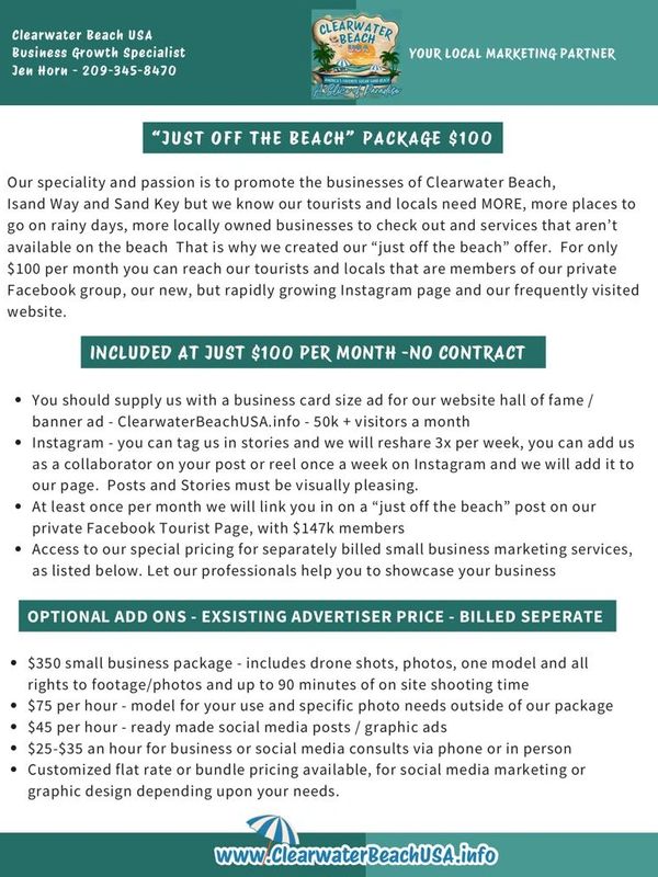 Our speciality and passion is to promote the businesses of Clearwater Beach, Island Way and Sand Key but we know our tourists and locals need MORE, more places to go on rainy days, more locally owned businesses to check out and services that aren’t available on the beach. That is why we created our “just off the beach” offer. For only $100 per month you can reach our tourists and locals that are members of our private Facebook group, our new, but rapidly growing Instagram page and our frequently visited website.